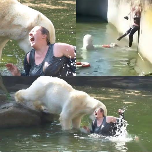 n a shocking incident on Friday, a 32-year-old woman was attacked by a polar bear after it jumped into her enclosure at the Berlin Zoo during feeding time. The woman, identified only as Maidy K, suffered multiple serious injuries before being rescued by zoo staff.
